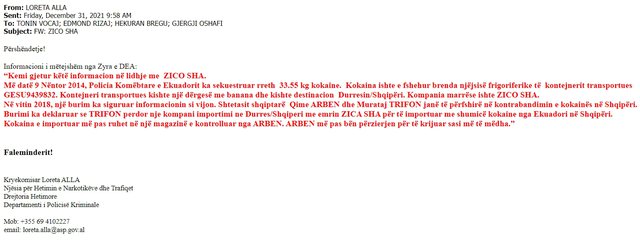 “Burimi ka deklaruar se TRIFON përdor një kompani importimi ne Durrës/Shqipëri me emrin ZICA SHA për të importuar me shumicë kokaine nga Ekuadori në Shqipëri. Kokaina e importuar më pas ruhet në një magazinë e kontrolluar nga ARBEN. ARBEN më pas bën përzierjen për të krijuar sasi më të mëdha.”- thuhet në e-mail.