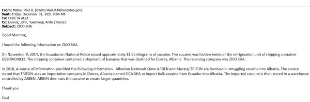 Informacioni i mëtejshëm nga Zyra e DEA: “Kemi gjetur këtë informacion në lidhje me ZICO SHA. Më datë 9 Nëntor 2014, Policia Kombëtare e Ekuadorit ka sekuestruar rreth 33.55 kg kokaine. Kokaina ishte e fshehur brenda njësisë frigoriferike të kontejnerit transportues GESU9439832. Kontejneri transportues kishte një dërgesë me banane dhe kishte destinacion Durresin/Shqipëri. Kompania marrëse ishte ZICO SHA.