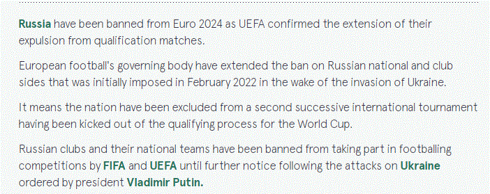 “Kombëtarja ruse nuk do të marrë pjesë në shortin e kualifikueseve për EURO 2024. Arsyeja është vendimi i marrë në shkurt nga UEFA për të përjashtuar të gjitha ekipet ruse nga garat që janë nën mbikëqyrjen e kësaj organizate, deri në një njoftim tjetër”- Shkruan Rusia.